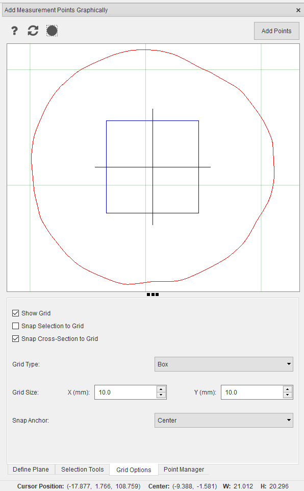The graphical selection window can be used to select measurement points on a cross-section of the sample. To graphically add measurement points, click Insert > Measurement Points > Graphical Selection. The graphical selection window consists of two sections: a graphics view (top) and a control panel (bottom) which contains a few tabs. The cross-sectional plane is shown in the 3D graphics window when the graphical selection window is opened and removed when the window is closed.